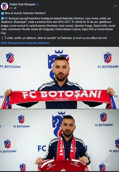 ”Bine ai revenit, Radoslav Dimitrov! FC Botoșani anunță transferul fundașului lateral Radoslav Dimitrov, care revine, astfel, pe Stadionul „Municipal”, unde a evoluat între anii 2015-2017.