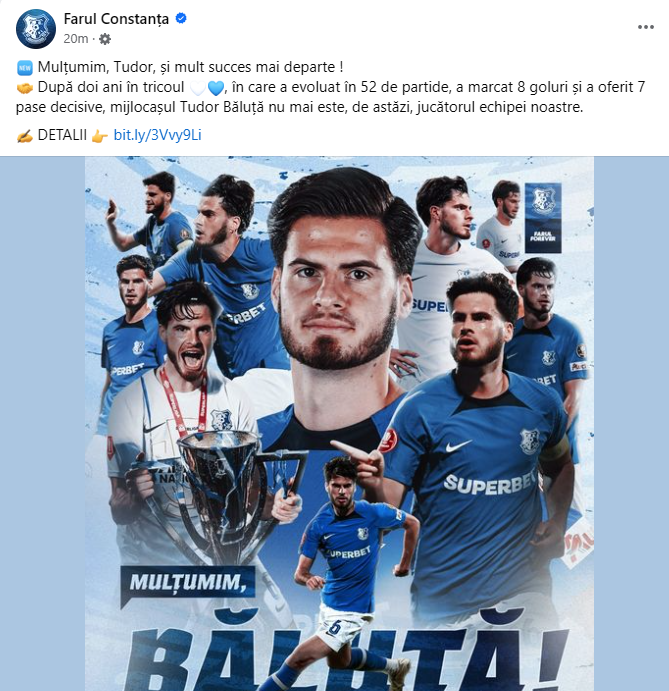 „Începând de astăzi, mijlocașul Tudor Băluță nu mai este jucătorul echipei noastre, după ce contractul acestuia a expirat. Produs al Academiei Hagi, Tudor Băluță a fost unul dintre cei mai importanți jucători ai Farului în ultimii doi ani, contribuind decisiv la succesul din sezonul 2022-2023, în care echipa noastră a devenit campioana României. În cei doi ani în tricoul alb-albastru, Tudor Băluță a evoluat în 52 de partide, a marcat 8 goluri și a oferit 7 pase decisive.
