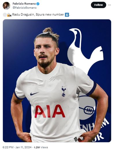 Până la prezentarea oficială a jucătorului român, jurnalistul Fabrizio Romano a ajunțat cu ce număr va juca Radu Drăgușin la Tottenham. El și-a ales numărul 6 pe tricou, cifră de „titular”. La Genoa a jucat cu 5, dar numărul este rezervat pentru mijlocașul danez Emile Hojbjerg.