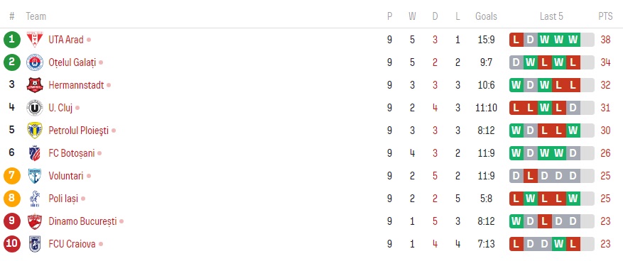 Clasamentul după golurile marcate de Dinamo și Oțelul: