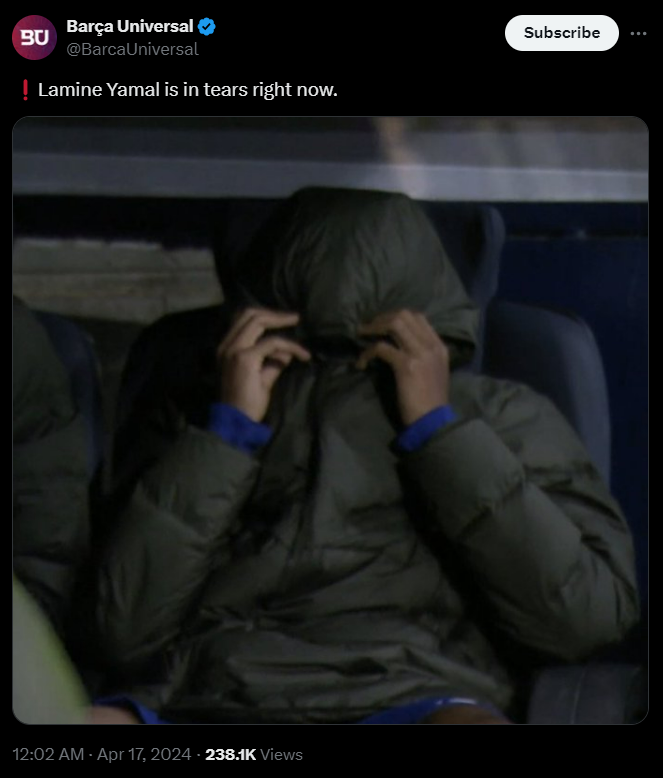 Yamal a fost vizibil afectat de rezultatul final. Tânărul atacant spaniol a fost surprins plângând pe banca de rezerve. Acesta a încercat să-și ascundă emoțiile, acoperindu-și fața cu gluga de la geacă.
