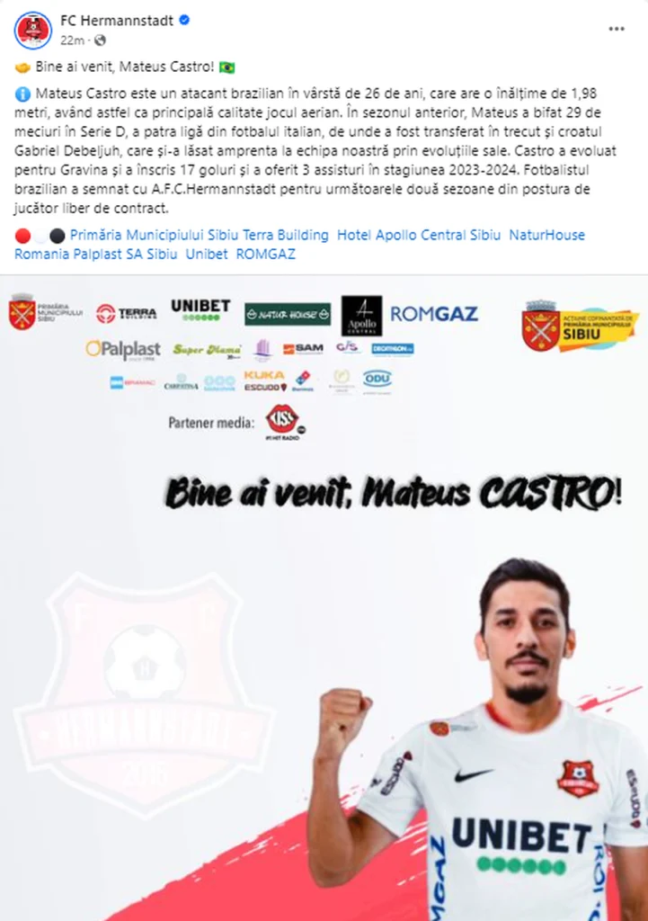 Potrivit gsp.ro, după semnarea contractului cu Hermannstadt, Mateus Castro, care a evoluat sezonul trecut la Gravina în liga a patra italiană, a primit o ofertă mai atractivă din punct de vedere financiar de la o echipă din liga a doua a Arabiei Saudite. În aceste condiții, atacantul ar dori să rupă contractul cu formația sibiană pentru a accepta oferta saudiților.