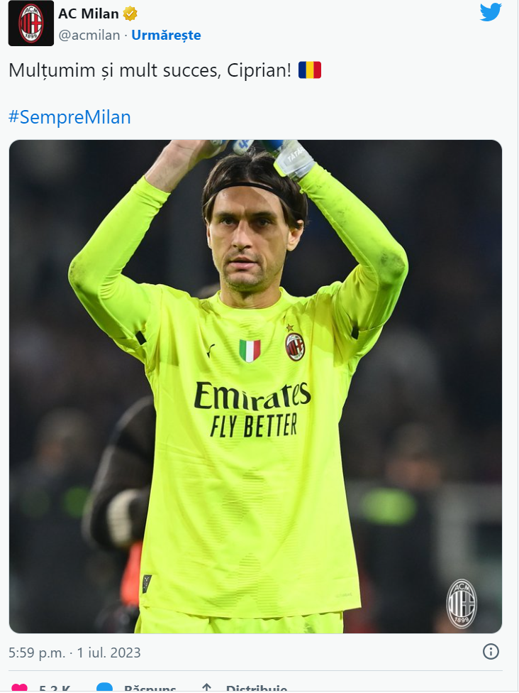 „Mulțumim și mult succes, Ciprian!”, a transmis AC Milan, prin intermediul paginii oficiale de Twitter, iar postarea a generat mii de like-uri și sute de comentarii din partea fanilor.
