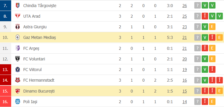 Medieșenii ocupă locul 7 în play-out, cu 18 puncte, iar Dinamo este pe poziția a 9-a, cu 15 puncte.