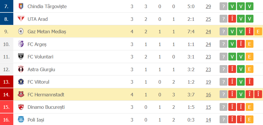 De partea cealaltă, Gaz Metan este pe locul 6, prima poziție salvatoare din play-out. Medieșenii au 22 de puncte, cu 3 mai multe decât Viitorul și cu 5 decât Hermannstadt.