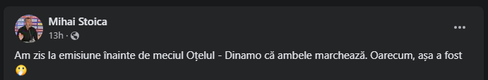 Am zis la emisiune, înainte de meciul Oţelul –Dinamo, că ambele marchează. Oarecum, aşa a fost”, a scris Meme Stoica pe reţelele de socializare.