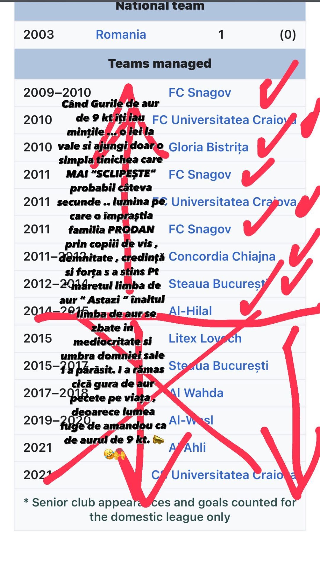Dacă până acum Ana s-a legat mai mult de viața personală a tehnicianului, menționând la un moment dat faptul că Reghecampf era nimeni până să se cupleze cu ea, acum a început să arunce cu noroi și în direcția carierei. Impresara a postat pe Instagram o imagine în care sunt enumerate echipele la care a antrenat Laurențiu Reghecampf, imagine peste care a scris un mesaj dur.