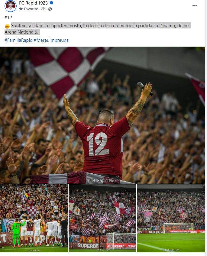„Suntem solidari cu suporterii noștri, în decizia de a nu merge la partida cu Dinamo, de pe Arena Națională ”, a fost mesajul publicat pe pagina oficială de Facebook.