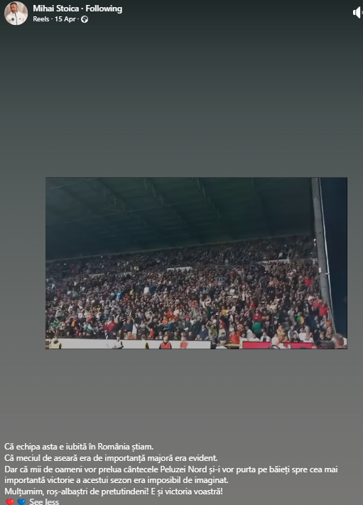 ”Că echipa asta e iubită în România știam. Că meciul de aseară era de importanță majoră era evident. Dar că mii de oameni vor prelua cântecele Peluzei Nord și-i vor purta pe băieți spre cea mai importantă victorie a acestui sezon era imposibil de imaginat. Mulțumim, roș-albaștri de pretutindeni! E și victoria voastră!”, a notat MM Stoica pe contul său personal de Facebook.