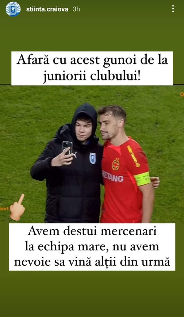 Puștiul de la grupele de copii ale CSU este acuzat că și-a făcut poză cu Darius Olaru după ce Universitatea a pierdut cu 3-0 în fața FCSB. Imaginea pentru arhiva personală ar putea să-l coste pe adolescent locul în academie. Din informațiile obținute de playsport.ro, nici conducătorilor echipei nu le-a convenit situația. Aceștia îl vor convoca pe Mario la o ședință în care îi vor cere să nu mai repete astfel de gesturi. De altfel, aceasta va deveni o regulă pentru juniorii academiei de la Craiova. Băieții de la tineretul Universității vor primi interzis să își mai facă poze cu fotbaliști ai altor echipe după jocuri.