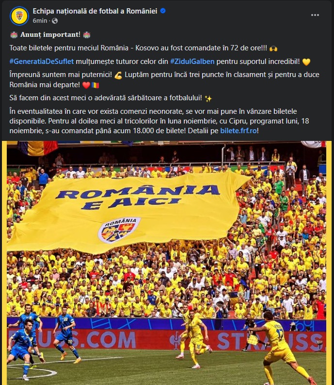 La România – Kosovo se vor mai pune în vânzare bilete doar dacă vor exista retururi din partea celor care și le-au rezervat până în acest moment. De la punerea în vânzare a biletelor la partidele din noiembrie au trecut doar 72 de ore.