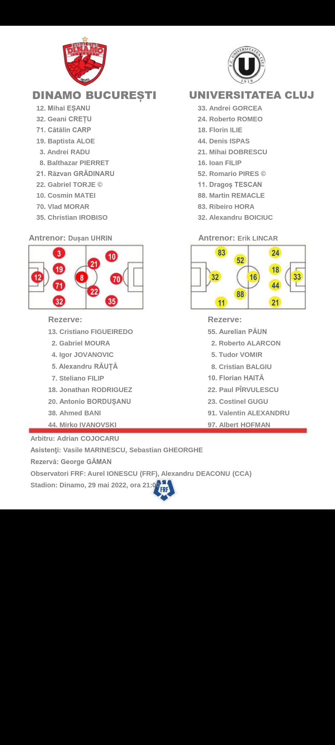 UPDATE 19:40. Avem echipele de start. Dinamo – U Cluj. ECHIPELE DE START: