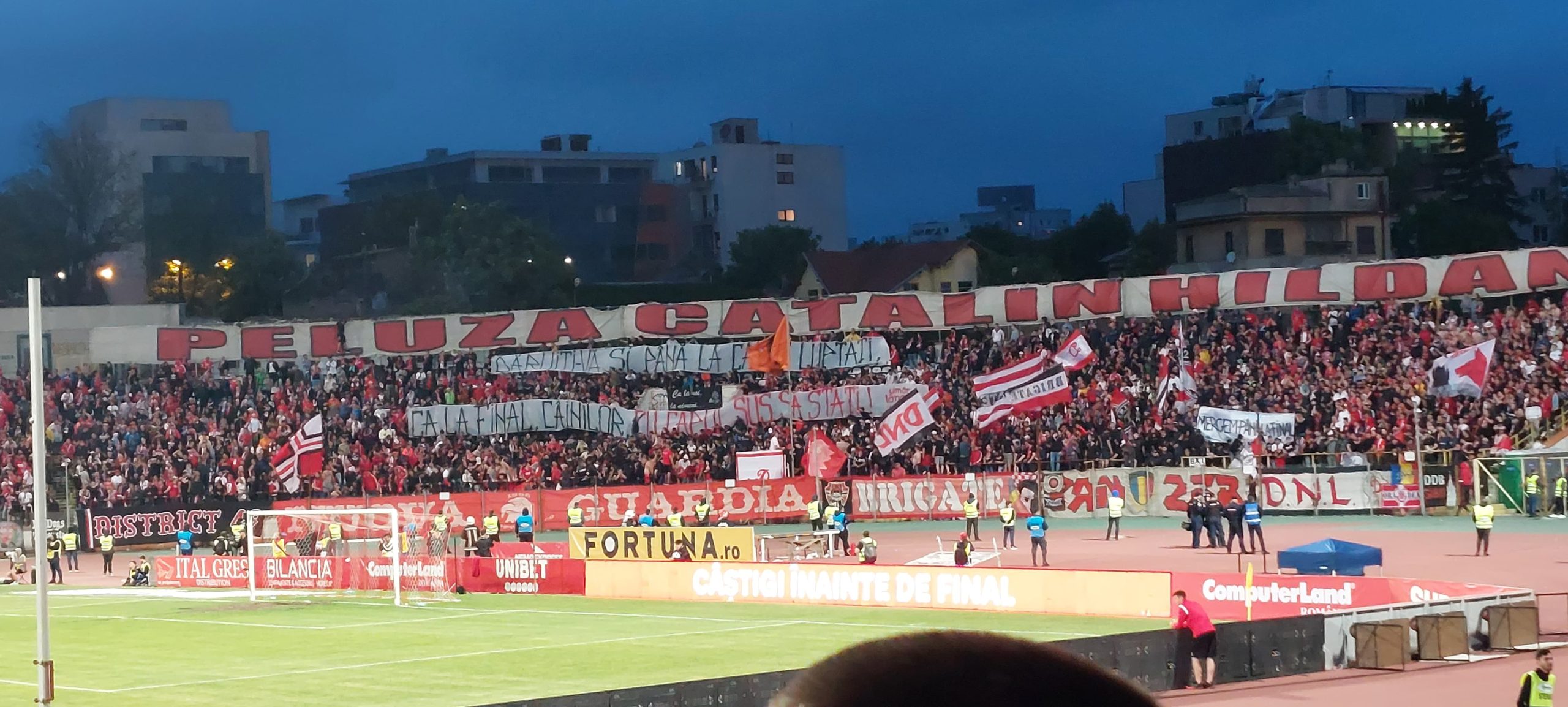 INFO: „Dăruiți-vă și până la capăt luptați / Ca la final, câinilor, cu capul sus să stați”, banner afișat în Peluza Cătălin Hîldan.