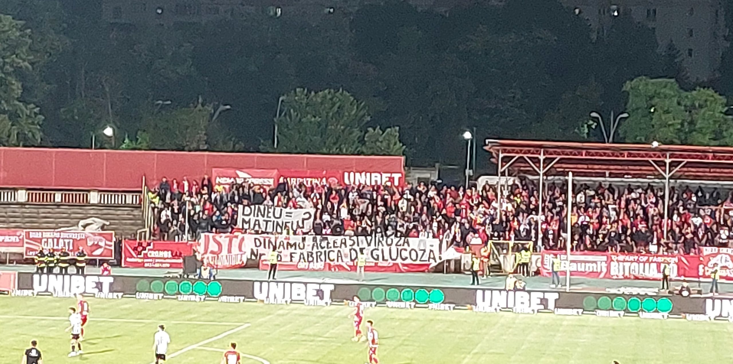 INFO: „Dineu egal matineu” este un banner afișat de fanii lui Dinamo. Referire clară la masa dată de Nicolae Badea jucătorilor, în urmă cu ceva timp.