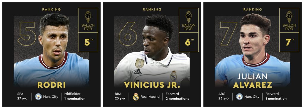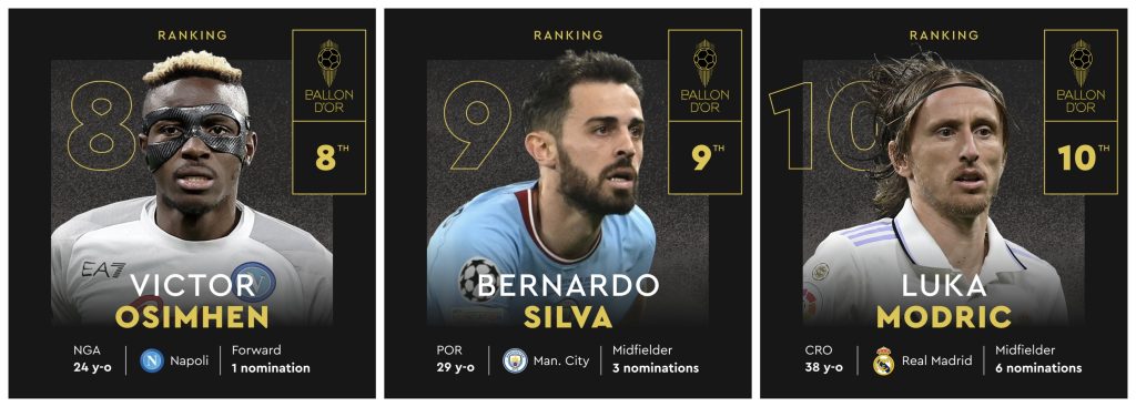 22:13 Pozițiile 8, 9 și 10 au fost dezvăluite! Osimhen de la Napoli e pe 8, Bernardo Silva pe 9, iar Modric pe 10!