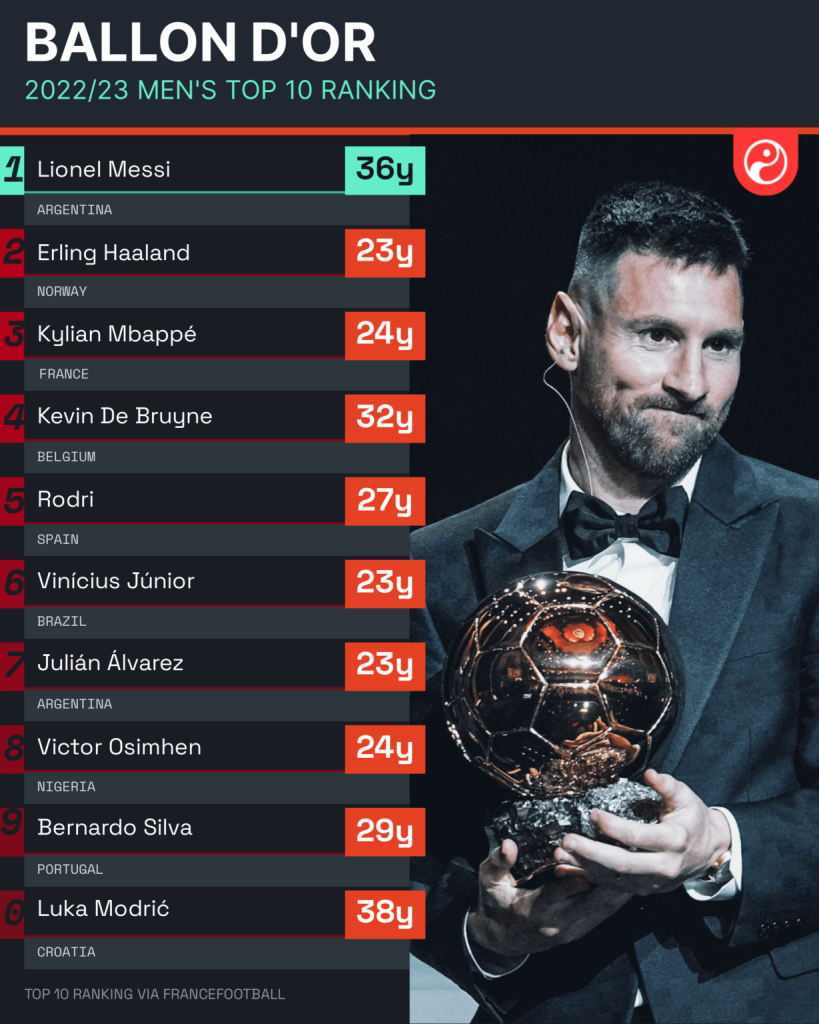 17:15 Dacă se impune diseară, Messi va fi al doilea cel mai în vârstă câștigător al „Balonului de Aur” în istoria trofeului. Acum, poziția a doua îi aparține campionului din 2022, Karim Benzema, iar podiumul e închis de victoria lui Messi din 2021.