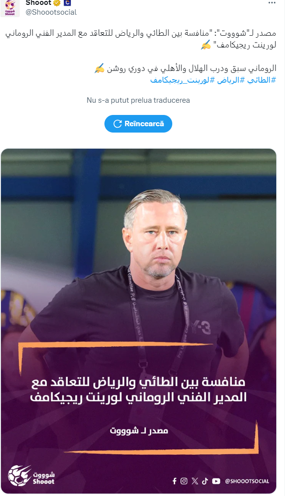 „O sursă a declarat pentru Shooot: ’Există o competiție între Al-Tai și Riyadh pentru semnătura antrenorului român Laurențiu Reghecampf”, au transmis cei de la Shoot, prin intermediul rețelelor de socializare.