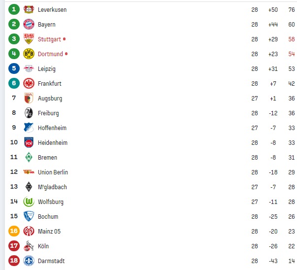 Astfel, după această etapă, diferența dintre primele două poziții este de 16 puncte, ceea ce înseamnă că, dacă se vor impune în următoarea etapă, în disputa cu Werder Bremen, elevii lui Xavi Alonso vor deveni campioni. Bayern mai poate face maxim 18 puncte în acest sezon, ceea ce înseamnă că orice victorie a lui Leverkusen, în următoarele șase etape, duce titlul acolo.