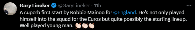 Fostul internațional englez, Gary Lineker, a transmis pe contul său de social media că a fost încântat de debutul tânărului fotbalist și că Southgate s-ar putea baza pe serviciile sale la Euro. „Un debut superb ca titular la naționala Angliei pentru Mainoo. Nu doar că a reușit să se integreze în echipă, dar ar putea să fie chiar titular la Euro. Felicitări tânărului jucător”.