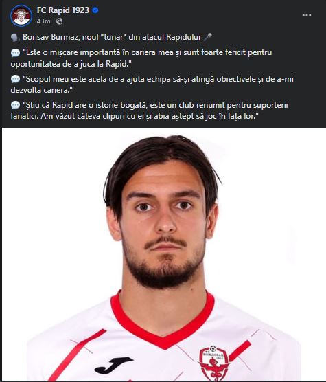 „Ghici ce ne-a adus Moșul Rapidist? Cel de-al doilea marcator din Superliga Serbiei va fi jucătorul Rapidului cel puțin pentru doi ani și jumătate! Welcome, Borisav Burmaz!”, a fost anunțul oficial făcut de Rapid.