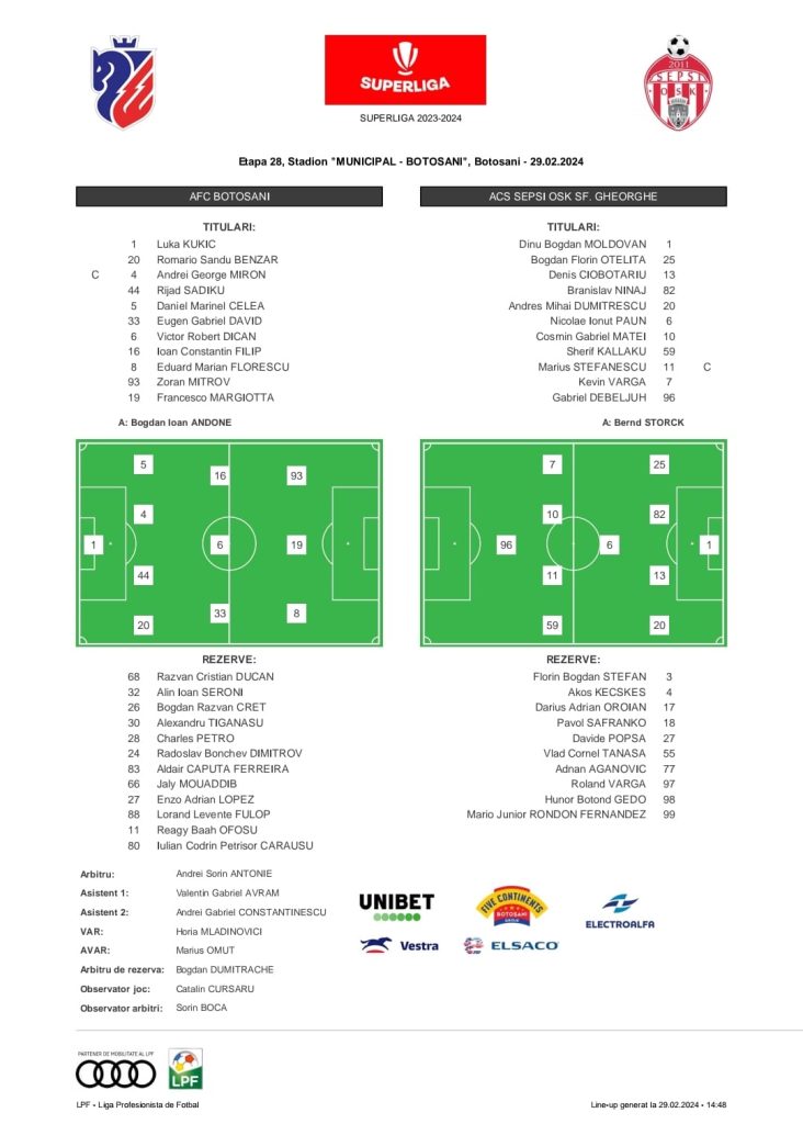 FC BOTOȘANI (4-3-3): Kukic – Benzar, Sadiku, A. Miron (cpt.), Celea – E. David, Dican, I. Filip – Ed. Florescu, Margiotta, Mitrov