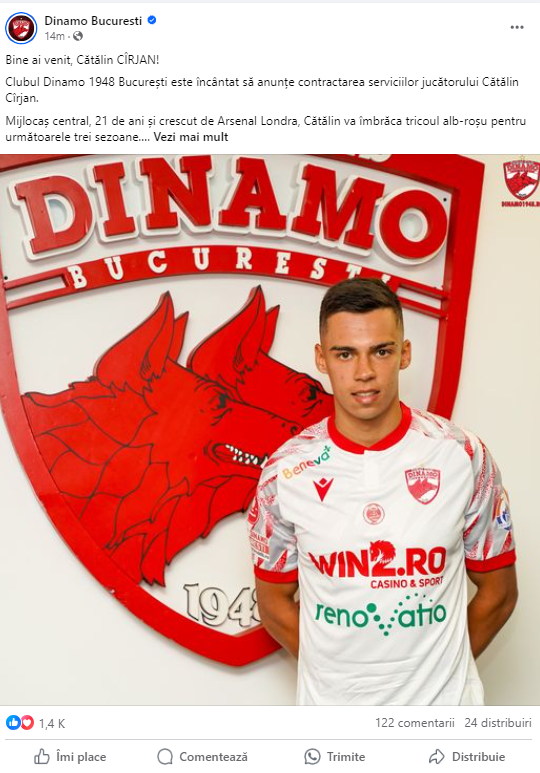 „Bine ai venit, Cătălin CÎRJAN! Clubul Dinamo 1948 București este încântat să anunțe contractarea serviciilor jucătorului Cătălin Cîrjan.