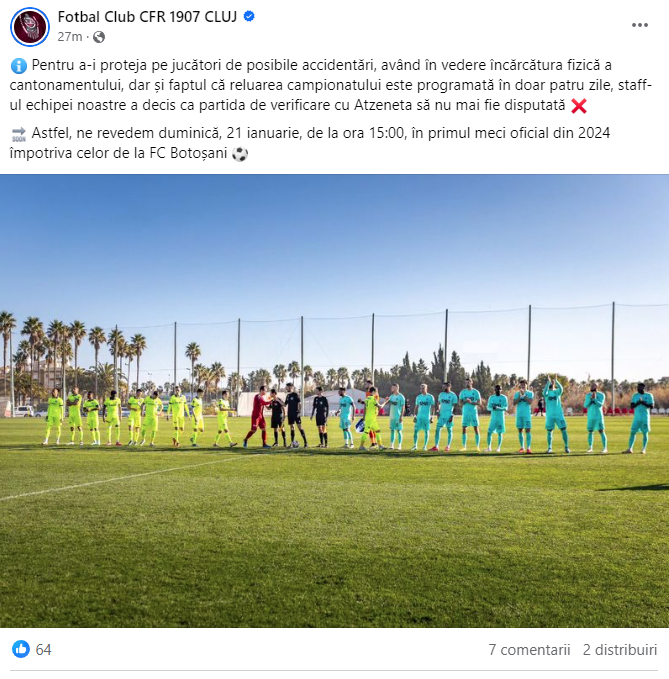 Miercuri, de la ora 12:00, CFR Cluj avea programată o partidă amicală cu spaniolii de la Atzeneta. Însă, formația ardeleană și-a anulat partida în ultimul moment.