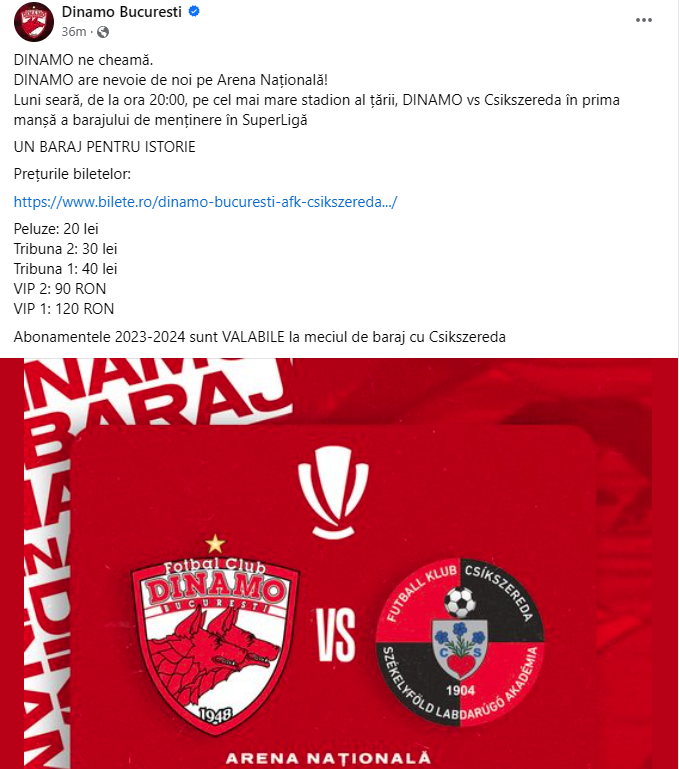 VIP 1: 120 RON”, se arată în comunicatul publicat de Dinamo pe Facebook.