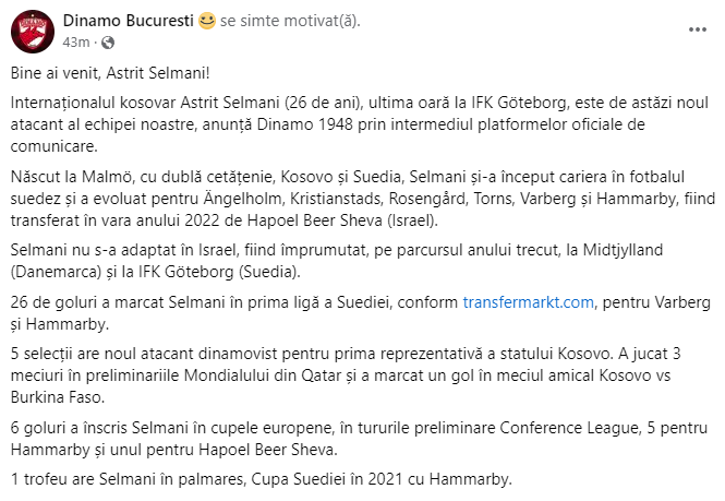 Internaționalul kosovar Astrit Selmani (26 de ani), ultima oară la IFK Göteborg, este de astăzi noul atacant al echipei noastre, anunță Dinamo 1948 prin intermediul platformelor oficiale de comunicare. Născut la Malmö, cu dublă cetățenie, Kosovo și Suedia, Selmani și-a început cariera în fotbalul suedez și a evoluat pentru Ängelholm, Kristianstads, Rosengård, Torns, Varberg și Hammarby, fiind transferat în vara anului 2022 de Hapoel Beer Sheva (Israel). Selmani nu s-a adaptat în Israel, fiind împrumutat, pe parcursul anului trecut, la Midtjylland (Danemarca) și la IFK Göteborg (Suedia).
