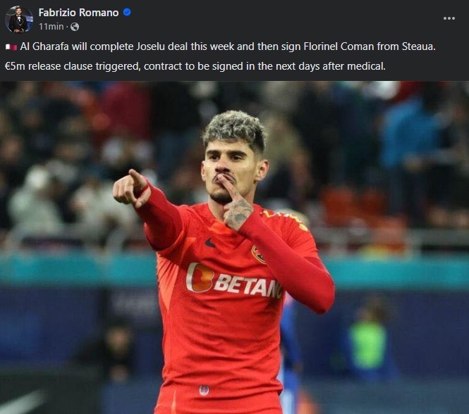 Prin intermediul rețelelor de socializare, Fabrizio Romano a anunțat că Florinel Coman va semna contractul cu Al Gharafa imediat după ce va trece de vizita medicală. „Joselu va semna contractul cu Al Gharafa săptămâna aceasta, iar ulterior îl va prezenta pe Florinel Coman de la Steaua. Clauza de reziliere în valoare de 5 milioane de euro a fost activată, contractul urmează să fie semnat zilele următoare după ce jucătorul va efectua vizita medicală”, a scris jurnalistul italian.