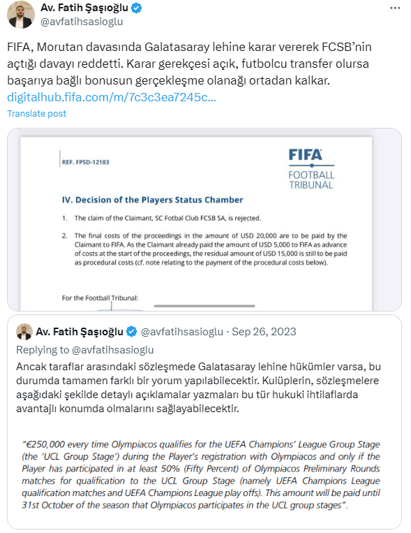 Documentul oficial al FIFA Football Tribunal a fost publicat pe site-ul oficial al forului mondial și a fost preluat de avocatul turc în drept sportiv Fatih Sasioglu, pe contul său de pe platforma X.