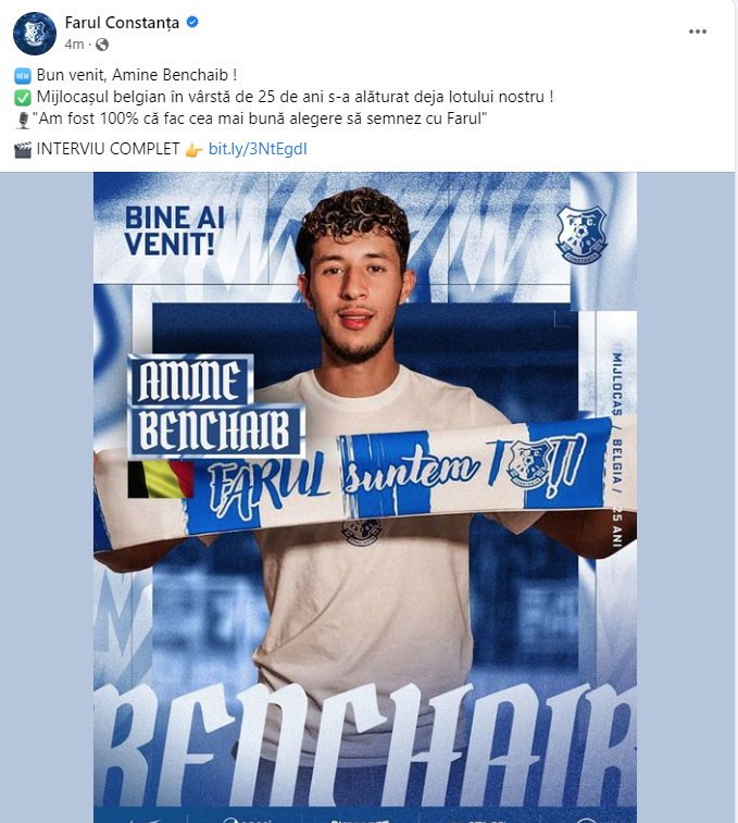 „Începând de astăzi, mijlocașul Amine Benchaib, care deține dublă cetățenie belgiană și marocană, este noul jucător al echipei noastre. În vârstă de 25 ani, Amine Benchaib evoluează pe postul de mijlocaș ofensiv și în carieră a mai jucat în țara natală pentru Lokeren, Charleroi și Kortrijk, dar și în România, pentru CS Mioveni, în sezonul recent încheiat”, se arată în comunicatul emis de Farul.