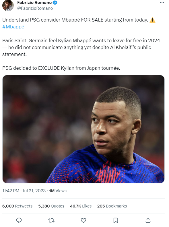 Faimosul jurnalist Fabrizio Romano a anunțat că Mbappe a fost exclus din lotul PSG-ului și pus pe lista de transferuri. În prezent, jucătorii campioanei Franței participă la un turneu desfășurat în Japonia.