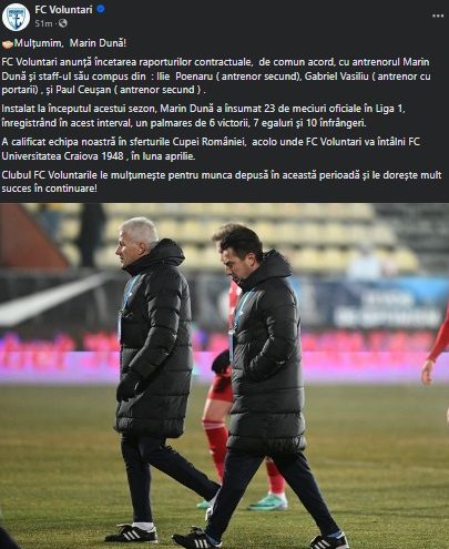 ”Mulțumim, Marin Dună! FC Voluntari anunță încetarea raporturilor contractuale, de comun acord, cu antrenorul Marin Dună și staff-ul său compus din : Ilie Poenaru ( antrenor secund), Gabriel Vasiliu ( antrenor cu portarii) , și Paul Ceușan ( antrenor secund ) .