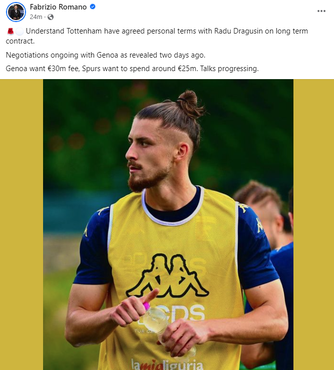 Tot Fabrizio Romano susține că, în momentul de față, Tottenham mai trebuie să se înțeleagă cu Genoa, pentru ca transferul să se realizeze. Se pare că Genoa cere 30 de milioane de euro pentru Drăgușin, în timp ce Tottenham este dispusă să ofere aproximativ 25 de milioane.