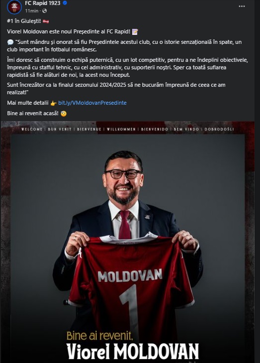 „Sunt mândru și onorat să fiu Președintele acestui club, cu o istorie senzațională în spate, un club important în fotbalul românesc. Îmi doresc să construim o echipă puternică, cu un lot competitiv, pentru a ne îndeplini obiectivele, împreună cu stafful tehnic, cu cel administrativ, cu suporterii noștri. Sper ca toată suflarea rapidistă să fie alături de noi, la acest nou început. Sunt încrezător ca la finalul sezonului 2024/2025 să ne bucurăm împreună de ceea ce am realizat!”, a transms Moldovan pentru pagina Rapidului.
