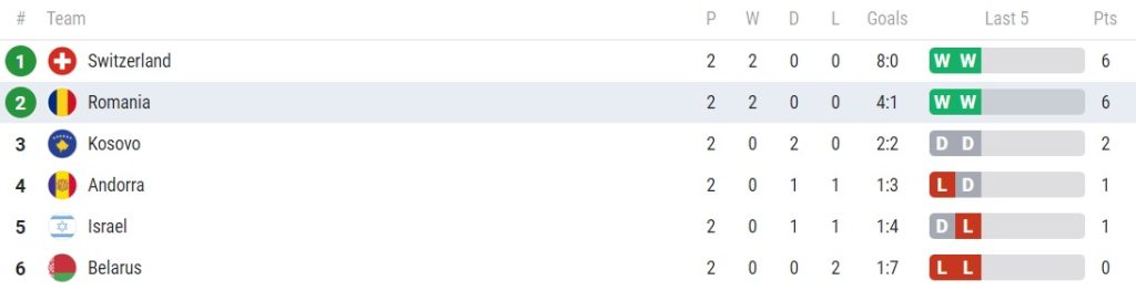 Naționala lui Iordănescu a început perfect campania pentru Euro 2024, cu 6 puncte căștigate din 6 posibile. România are deja 4 puncte avans față de locul 3, ocupat de Kosovo. Israel, echipa de care ne temeam după tragerea la sorți, a câștigat doar un punct din dubla cu Elveția și Kosovo și e penultima în grupă. Primele două clasate obțin calificarea directă la turneul final din Germania.