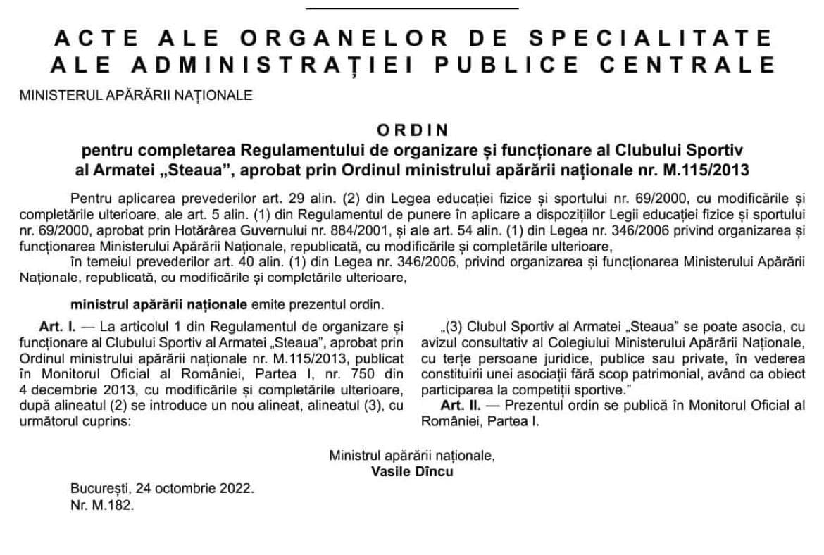 Mai precis, ordinul semnat de Dîncu pe 24 octombrie autorizează Clubul Sportiv al Armatei să se asocieze cu terțe persoane juridice, publice sau private, pentru constituirea unei asociații fără scop patrimonial care să aibă ca obiect participarea la competiții sportive.