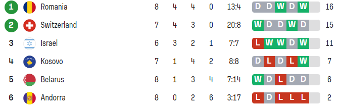 Avem nouă goluri avantaj faţă de echipa lui Alon Hazan. În contetul în care şi reprezentativa statului evreu va juca un meci împotriva andorrezilor. Şi ar putea şi ea să îşi îmbunătăţească situaţia la acest capitol. În acest moment, Stanciu & Co au 5 puncte avantaj faţă de israelieni şi unul faţă de elveţieni.