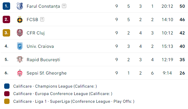Farul este noua campioană a României, după ce a câștigat 3-2 cu FCSB, Rapid a pierdut azi meciul de acasă cu Universitatea Craiova, 2-3, astfel că locurile 1, 2, 5 și 6 din playoff sunt deja stabilite.