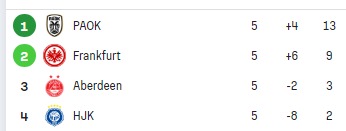 Clasamentul grupei G din Conference League, din care face parte și PAOK