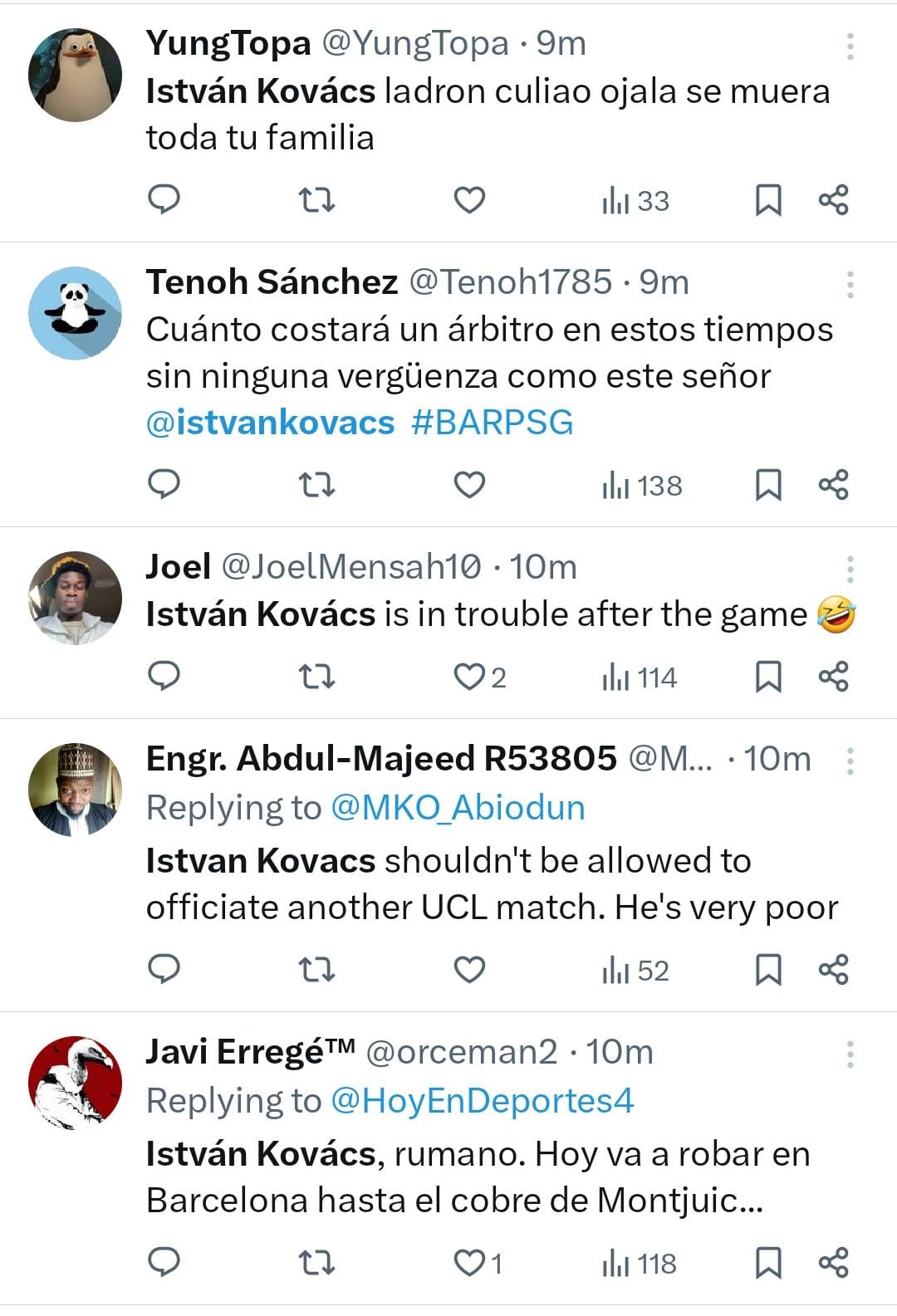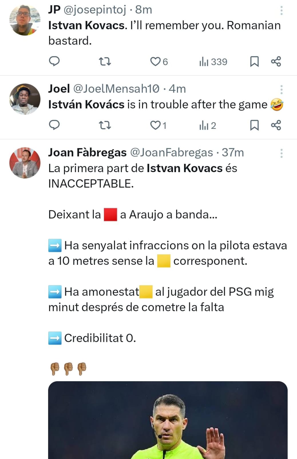 Fanii Barcelonei l-au „taxat”, în mediul online, pe Kovacs, postând mai multe mesaje dure: „ce a făcut Kovacs aduce aminte de meciurile trucate”, „n-o să se poată plimba prin Barcelona”, „Kovacs o să aibă probleme după meci”, „N-ar trebui să mai fie lăsat să arbitreze alt meci din UCL”.