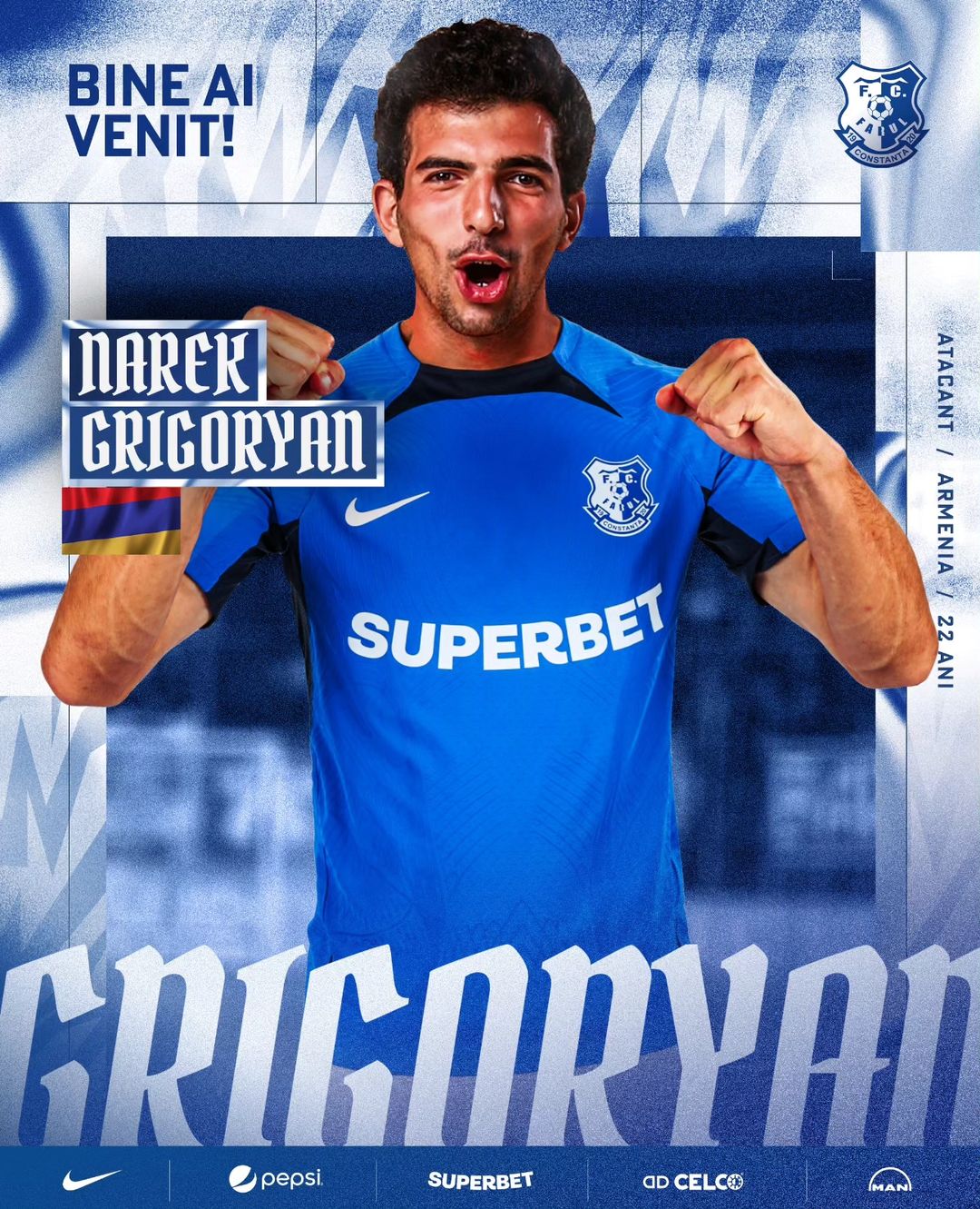 Cu numai o zi înainte de meciul de foc din Finalda, campioana en-titre a anunţat transferului lui Narek Grigoryan. În vârstă de 22 de ani, atacantul armean a fost ochit de Hagi în dubla manşă din Europa, cu FC Urartu.