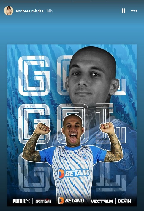 Imediat după meci, focoasa brunetă a postat un story pe contul oficial Instagram cu o imagine în care apare celebrul sportiv, fotografia fiind preluată de pe pagina administrată de reprezentații grupării din Craiova.