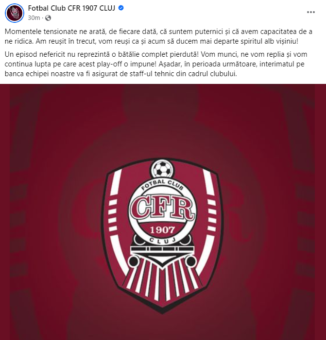 Un episod nefericit nu reprezintă o bătălie complet pierdută! Vom munci, ne vom replia și vom continua lupta pe care acest play-off o impune! Așadar, în perioada următoare, interimatul pe banca echipei noastre va fi asigurat de staff-ul tehnic din cadrul clubului”, se arată în mesajul postat de CFR Cluj, pe Facebook.