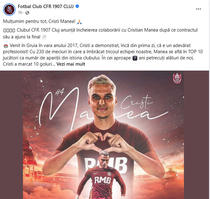 Clubul CFR 1907 Cluj anunță încheierea colaborării cu Cristian Manea după ce contractul său a ajuns la final.