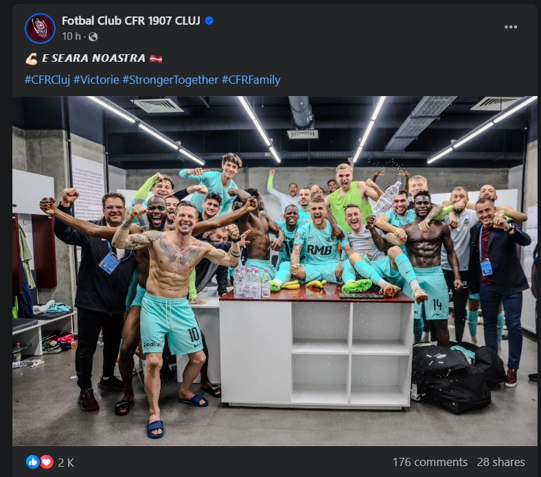 După victoria autoritară, ardelenii au sărbătorit în vestiar, momente imortalizate de camera foto și împărtășite rapid pe rețelele sociale. Fanii echipei conduse de Neluțu Varga au răspuns cu un val de aprecieri și laude. „E seara noastră! #CFRCluj #Victorie #StrongerTogether #CFRFamily”, au scris ardelenii pe rețelele sociale, alăturându-se unei fotografii din vestiar.