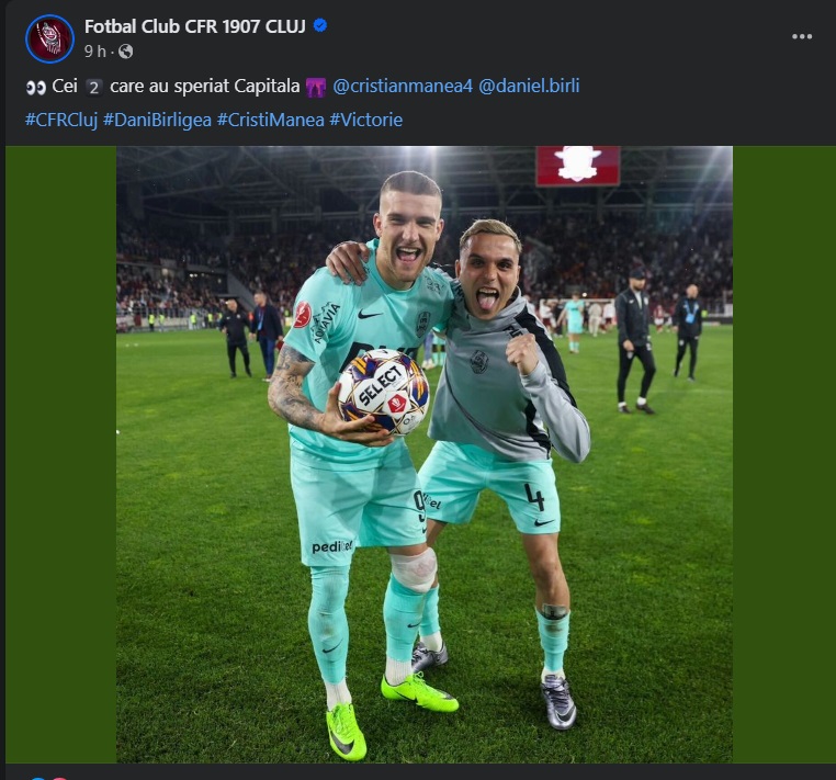 Momentul victoriei a fost marcat și de o imagine specială care îi prezintă pe cei doi marcatori ai lui CFR din meciul respectiv, Daniel Bîrligea, autorul unei triple, și Cristi Manea. „Cei doi care au speriat Capitala”, au adăugat cei din Gruia.
