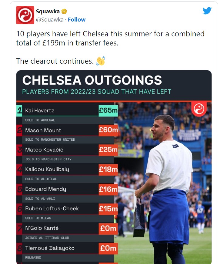 Mason Mount este al 10-lea fotbalist important ce pleacă de la Chelsea în această vară. El este, de asemenea, al doilea cel mai scump fotbalist vândut de londonezi în această vară, după Kai Havertz.