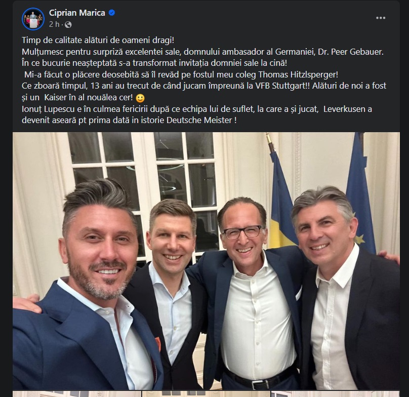 Într-o postare pe rețelele de socializare, Marica a împărtășit emoțiile trăite în cadrul unei cine la care a fost invitat de către ambasadorul Germaniei, Dr. Peer Gebauer.